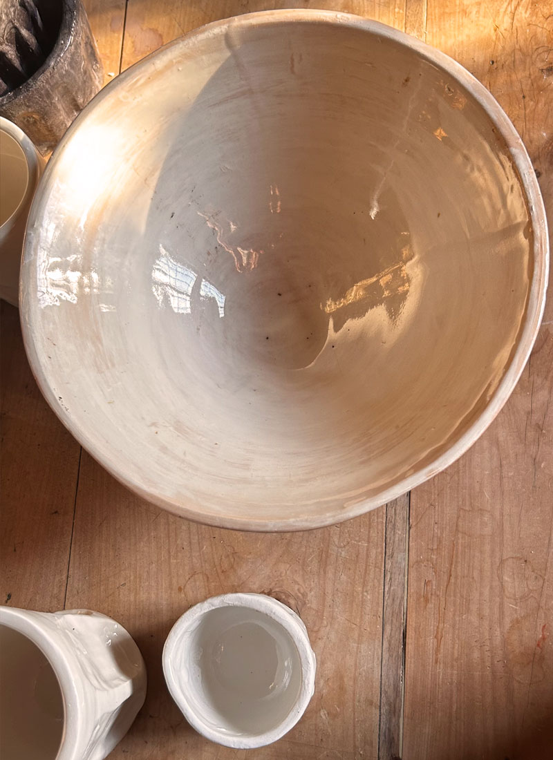 Bowl with thick, sturdy walls, interior treated with crystalline glaze, exterior walls raw.