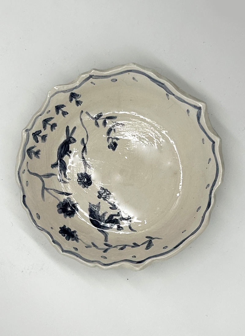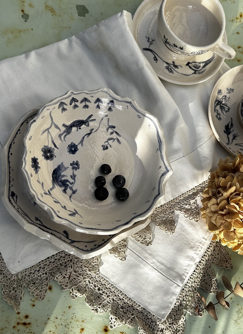 This plate set is part of a series of ceramics with evocative decorations that create little stories that are linked to each other or can also stand alone. A moment of peace should also bring a smile to your face.